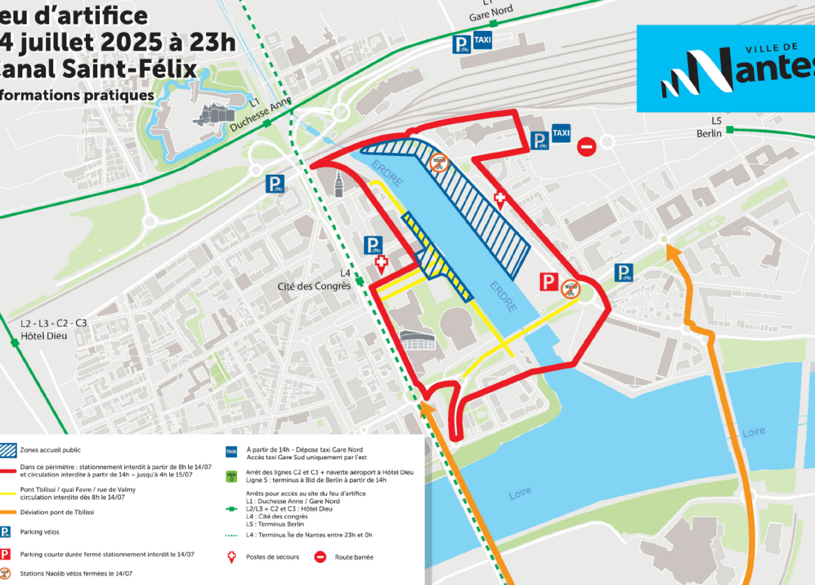 Pour la sécurité de toutes et tous, des interdictions de stationnement et de circulation vont être mises en place autour du Canal Saint-Félix entre le 14 et le 16 juillet. En effet, le pont Anne-de-Bretagne étant en travaux, cette année, le feu d’artifice de la fête nationale sera tiré depuis le pont de Tbilissi qui enjambe le Canal Saint-Félix. La circulation sera interdite :