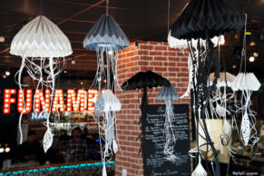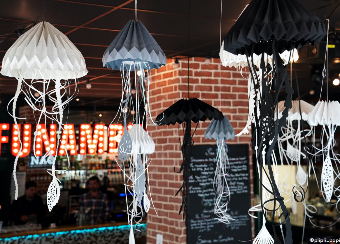 Pour donner vie à leurs envies, les associations de commerçants et de commerçantes ont fait appel aux savoir faire locaux. C’est l’artiste Fanny Massebiau (Plipli Papier Nouvelle fenêtre) qui a décoré les vitrines. Oiseaux, bateaux, phares, méduse ; c’est tout un monde marin de papier qui a pris vie. Côté façades, c’est l’atelier partagé Gueule de bois Nouvelle fenêtre a fabriqué des sculptures d’oiseaux pour donner vie à cette scénographie côté rue.